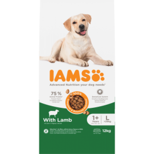 IAMS for Vitality voor volwassen honden van grote rassen is een 100% complete en uitgebalanceerde specialistische voeding. Ons heerlijke recept met lam voor wordt bereid met zorgvuldig geselecteerde, hoogwaardige dierlijke eiwitten om de gezondheid en vitaliteit van uw hond op 7 punten te ondersteunen. Honden moeten gezond, actief en vitaal zijn. Daarom bevat ons heerlijke recept 75% dierlijke eiwitten (van het totale eiwitgehalte). We streven ernaar om honden de geavanceerde voeding te bieden die ze nodig hebben met een heerlijke smaak, zonder compromissen, om de gezondheid en vitaliteit op 7 punten te ondersteunen. IAMS for Vitality verzorgt het gebit met krokante brokken en een optimaal gehalte aan mineralen om de vorming van tandsteen te helpen verminderen. Het recept ondersteunt de gezonde huid en glanzende vacht van uw hond dankzij de werking van omega 3 en 6. Zie hem rennen en springen dankzij essentiële mineralen, vitamine D en hoogwaardige eiwitten voor sterke botten en spieren. IAMS for Vitality bevat daarnaast een mix van antioxidanten met vitamine C en E ter ondersteuning van het immuunsysteem. Het recept ondersteunt de spijsvertering van uw hond met een speciaal vezelmengsel van onder meer prebiotica en bietenpulp. Onze recepten bevatten essentiële voedingsstoffen voor een gezond hart zodat u lang van uw geliefde huisdier kunt genieten. We hebben de verteerbaarheid van onze producten verbeterd met eiwitgehalten die zijn aangepast aan hun behoeften. IAMS ondersteunt de gezondheid en vitaliteit van uw hond op 7 punten die u elke dag kunt zien. gedroogde kip en kalkoen 24% (waaronder kip 14%), maïs, maïsgries, gerst, dierlijk vet, lam (4.3%), sorghum, gedroogde bietenpulp (2.7%), kippenjus, mineralen (waaronder natriumhexametafosfaat (0.38%)), fructo-oligosachariden (0.21%), gedroogde biergist. Analytische bestanddelen eiwit: 23%, vetgehalte: 13%, omega-6-vetzuren: 2.2%, omega-3-vetzuren: 0.17%, ruwe as: 6.3%, ruwe celstof: 2.0%, calcium: 1.3%, fosfor: 1.0%.